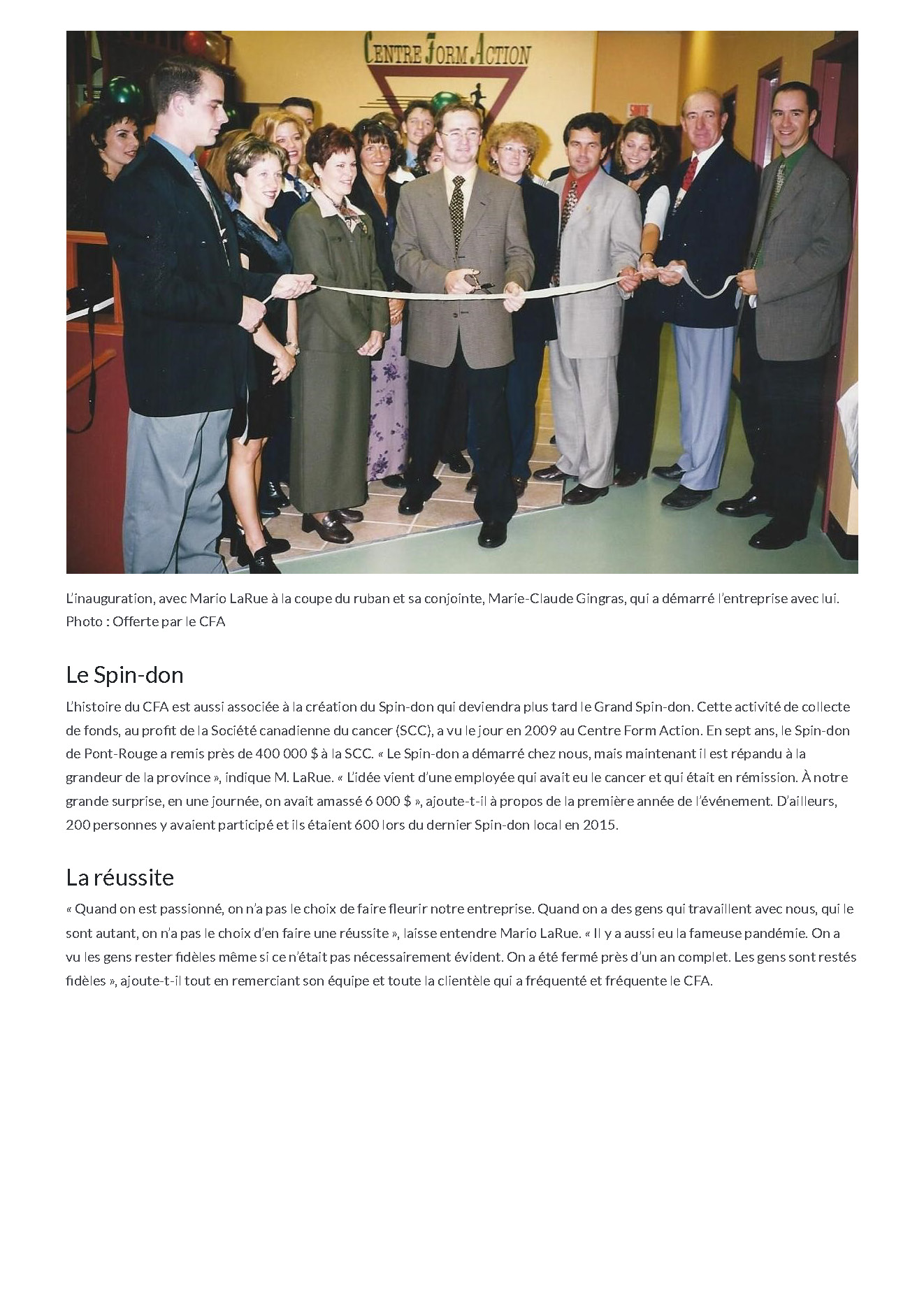 Cette activité de collecte de fonds au profit de la Société canadienne du cancer (SCC) a vu le jour en 2009 au Centre Form Action. Lors de la première édition, 200 participants ont pédalé dans une ambiance électrisante alors que plus de 600 participants l’ont fait lors de la dernière édition en 2015. En sept ans, le Spin-Don de Pont-Rouge a remis près de 400 000$ à la SCC . Il a aussi inspiré d’autres régions à reproduire un tel événement et a donné naissance en 2013 au Grand Spin Don de la Société canadienne du cancer.
